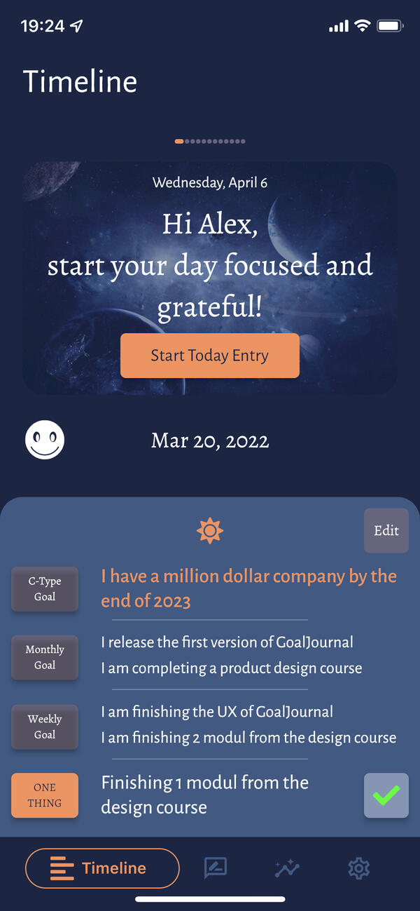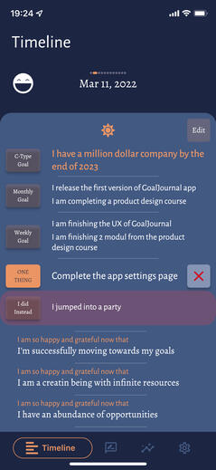 You can also use GoalJournal - Guided Gratitude Journal, Mood Tracker For Daily Motivation to set a BIG goal that you really want and into smaller, achievable goals, and then achieving each goal in a series of daily tasks.